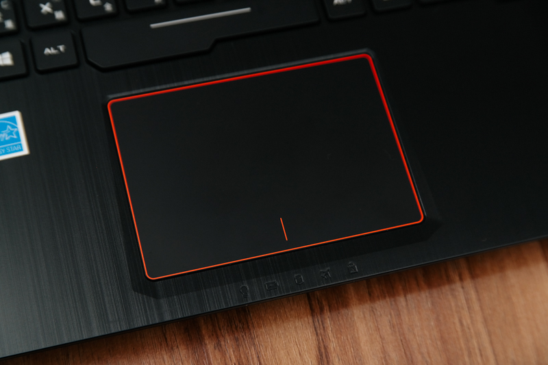 除了 A 蓋之外,裡面也全部都採用髮絲紋設計,質感真的很棒,在觸控板的部份採用無縫設計之外,再搭配一圈橘色線條圍繞,很像科幻電影中的電腦面板感覺。