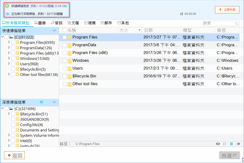 安裝開啟後,就按檔案遺失的位置來掃描吧,假設是 C 槽。