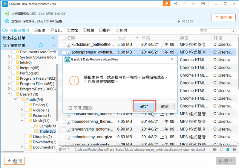 找到了就可以隨時在上方按停止,再點擊檔案預覽後看要不要恢復,因為掃描程序還未結束,所以系統提醒你現在恢復可能會不完整,急的話可以先點確定。