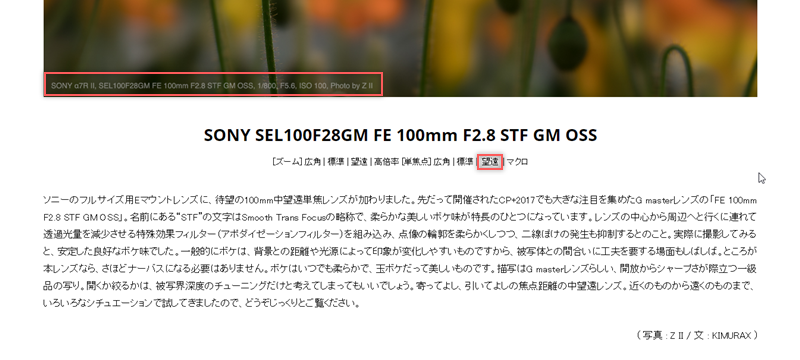 再往下是攝影師寫的簡介,並可以看到剛剛那張相片的左下角有一行小字標示拍攝細節,包括使用快門 1/800、光圈 5.6、感光度 100 等,然後在標題與簡介的中間是不同的鏡頭名稱,像這個相簿就是使用「單焦點」的「望遠鏡頭」拍攝,如果點其他鏡頭名稱就會連結到以那些鏡頭拍攝的專屬相簿。