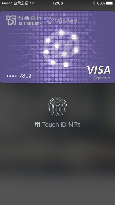 之後只要在支援 Apple Pay 的店家,開啟 Wallet 選擇要支付的信用卡,靠近感應器後用指紋掃描就可以了。