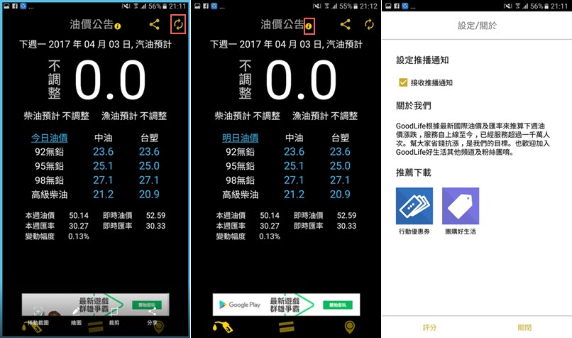 開啟後就以大大的「0.0」預測下周一的油價不會調整,並顯示今日中油、台塑的 92、95、98 無鉛和柴油的價格,可以點右上角隨時更新,底下也有油價與匯率的變動幅度可參考,點「今日油價」就會切換到明日,如果不想要一直提醒就把推播通知取消掉。