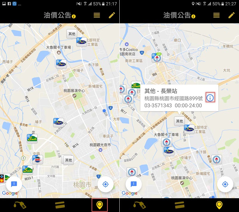切換到最後一頁會先要求取得定位,然後就會顯示出附近的加油站的 LOGO,不同品牌加油站的地址電話、營業時間,像這個「其他」其實是長榮加油站不知道為什麼沒顯示,點右邊圖示可以選擇功能。