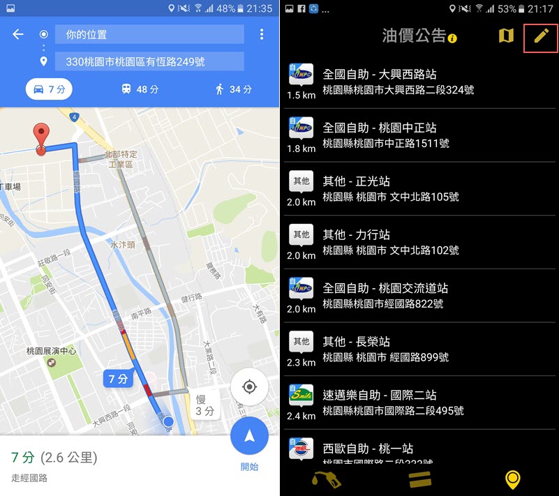 然後可以連結 Google 地圖導航,比較路線知道怎麼走,尤其在外地找加油站很好用啊,也可以將地圖切換成清單模式,如果要找特定的加油站,可以點右上角編輯。