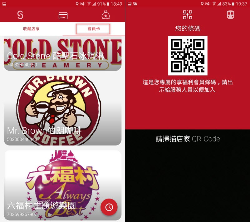 回到收藏商家的頁面,在旁邊「會員卡」的地方會看到剛剛有加入會員的店別,或者當你人在那間店的時候,在上排的項目滑到最左邊,使用條碼掃描來取得會員。