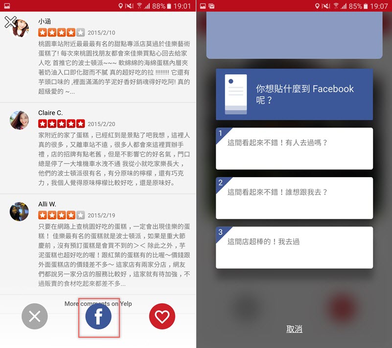 往下滑有其他人的評論,可以點臉書圖示,選擇想跟朋友分享的資訊、詢問的內容,或者直接揪人一起去。
