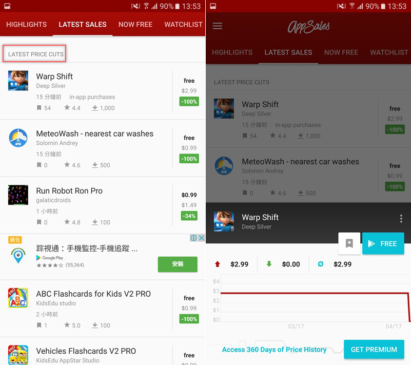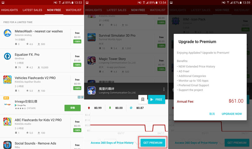 這裡就是限時免費區,一樣可以點名稱後面的藍色色塊連到 Play 商店,如果點下面「GET PREMIUM」就會出現「AppSales」付費版的相關資訊,包括可以加長歷史價格的時間範圍、免廣告等等,有需要就花$61 購買吧。