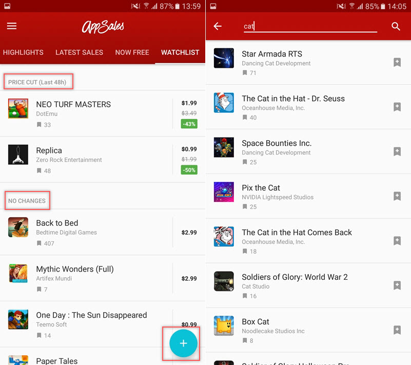 加入追蹤的 APP 會在最後一頁「WATCHLIST」裡,並將 48 小時內有促銷的排在前面,後面則是沒變動的,點右下角「+」可以打關鍵字搜尋,因為這個 APP 內容並沒有照生產國家分類(這也是個缺點,國外的 APP 比例太重),所以打中英文都可以搜尋。