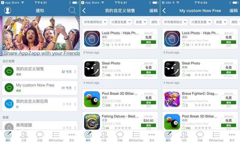 介紹另一個 iOS 的類似 APP「AppZapp Notify 」,是中文介面,大家應該會覺得親和一點,它比較著重在個人設定的細節,一樣可以設提醒,但要設帳號登入。