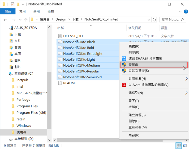 解壓縮後開啟,將七種字型檔案全選,按右鍵「安裝」即可。