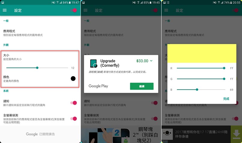 之前三星發布會上最引人注目的 Galaxy S8,其中一個特色就是螢幕四方的圓角設計,雖然這只是一個簡單的設計,但對於美感非常講究的人來說,一點點小小的改變都會讓手機用起來有不同的感受,於是就有人推出了「Cornerfly」這個 APP,只要裝上它,任何手機的使用介面都可以從尖銳的方角變成平滑的圓角,尤其現在大部分的手機本身四個角就是圓的了,讓螢幕介面也一起圓角,不是更完美?