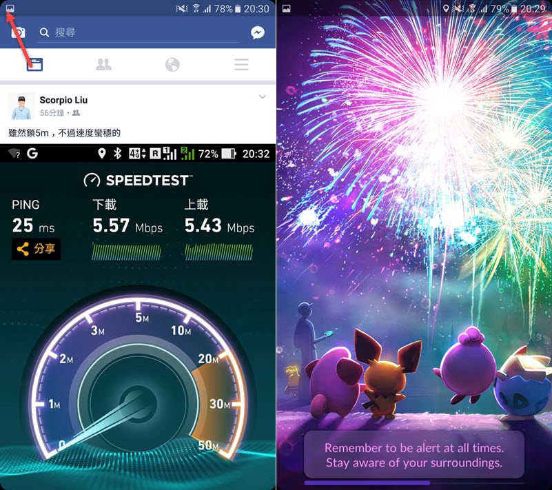 再來開其他程式看看,臉書首頁、寶可夢畫面,螢幕顯示都是圓角,大家用電腦看可能不清楚,放在手機裡比較明顯。