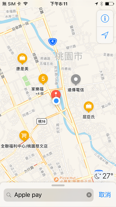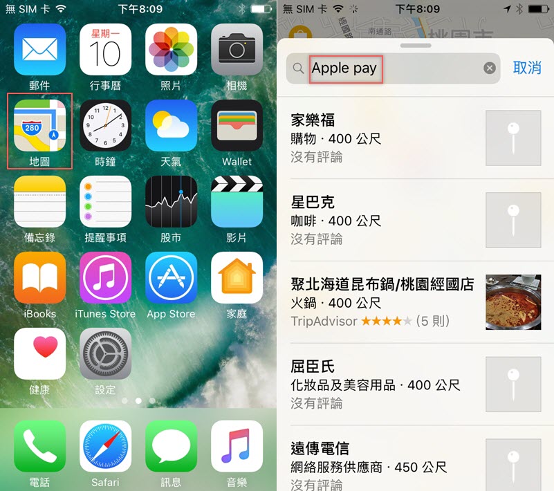 步驟非常簡單,只要打開手機裡的地圖,記得不要開到 Google 地圖哦(雖然大家應該平常都用 Google 地圖比較多),然後在搜尋列打上「Apple Pay」,下面就直接列出附近有支援的商家了。