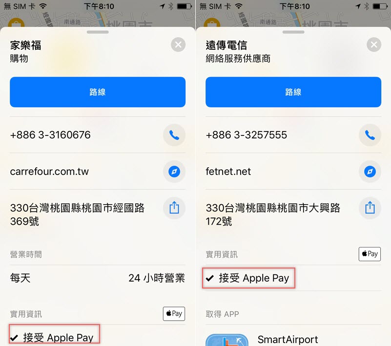 點進去商家名稱,也會在底下的實用資訊中看到「接受 Apple Pay」這一項。