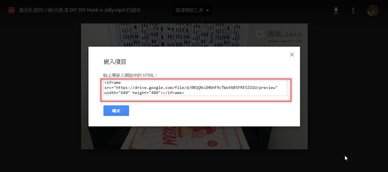 跳出的視窗中「貼上要嵌入網站中的 HTML」下面就是影片的原始碼,複製起來愛貼哪裡就貼哪裡,當然只有網頁可以貼啦,試試看吧。