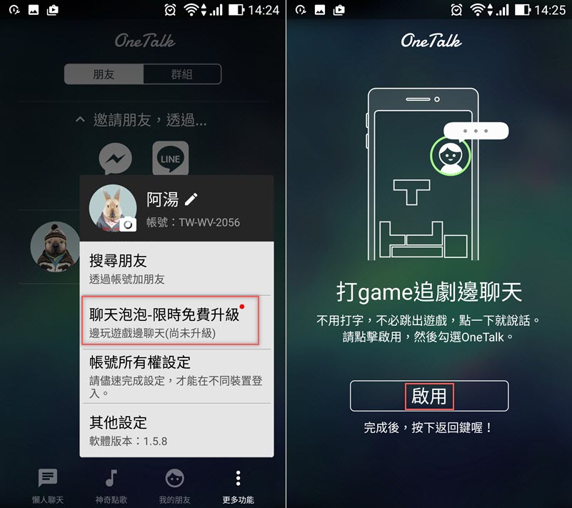 接下來就是這篇的重點,點「更多功能」會看到聊天泡泡,選擇之後再按「啟用」。