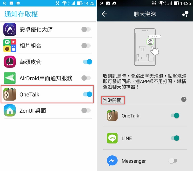系統會要求取得通知存取權,打開後,回到泡泡開關,下面有七個聊天程式可以設開啟。