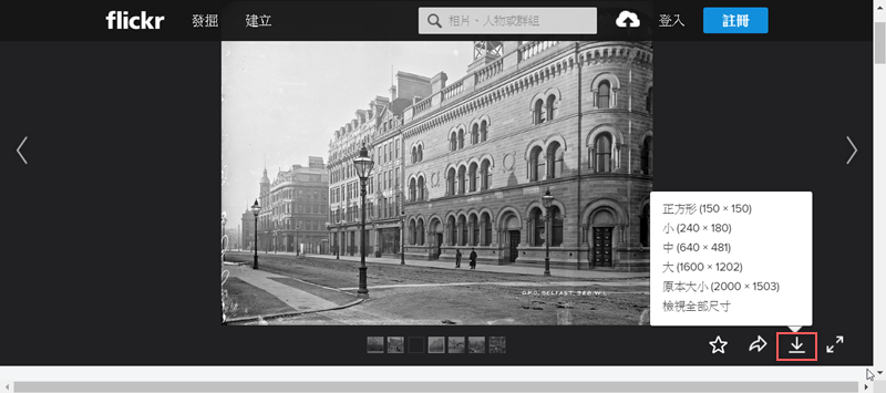 點進來連到 flickr 相簿,右下角就有下載圖示,還有多種尺寸可選,雖然沒有前面介紹的圖庫檔案大,也不一定清晰(因為是老照片嘛),但真的蠻特別的。