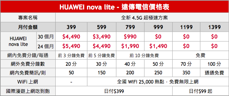 - 以上價格限 2017/4/30 前至遠傳/全虹門市申辦全新 4.5G 超極速方案,簽約 24/30 個月並預繳,若調降費率或提前退租視同放棄本專案贈送之優惠,且需繳交專案補貼款。