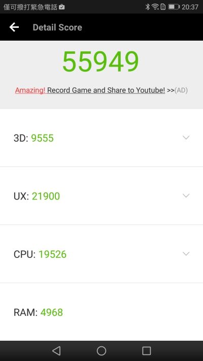 透過安兔兔跑分獲得 55949,算是有達到中階智慧型手機該有的水準。