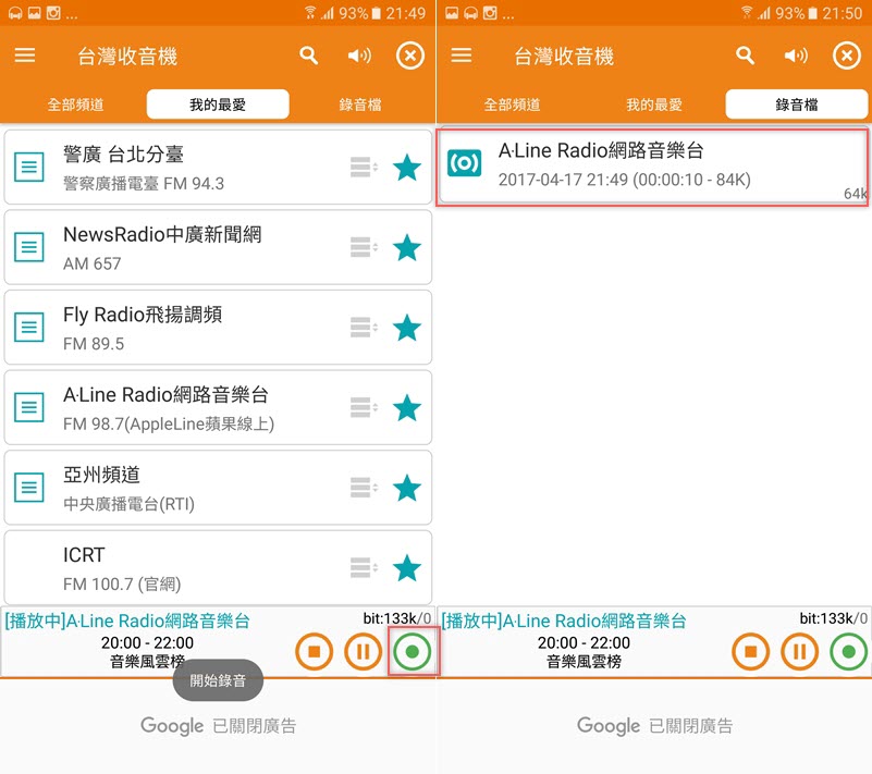 這個功能阿湯覺得不錯,以前聽收音機常聽到好聽的歌,但要錄音還要放空白錄音帶等等(透露年紀…),現在用 APP 點右下角錄音鍵就可以開始錄,並存在錄音檔區,想聽再拿出來即可。