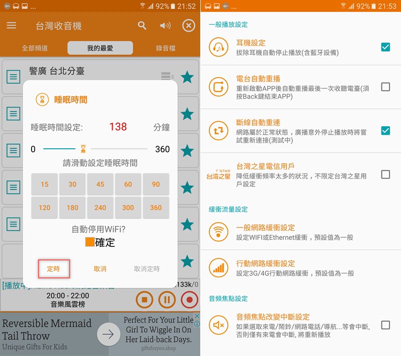 喜歡聽音樂入睡的可以用這個定時功能,選擇睡眠時間後看要不要自動停用 Wi-Fi,再按定時 OK 了,首頁左邊的設定清單拉出來也能對網路進階設定。