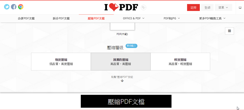 來試試 PDF 壓縮,壓縮的程度可以選輕度、極度或推薦,程度越高品質越差,還是選中度吧。