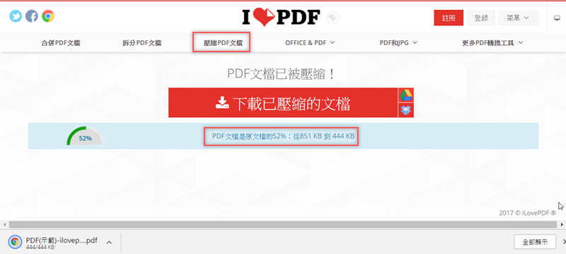 壓縮後是原本檔案的 52 %,從 851 KB 到 444 KB,打開後還蠻清晰的。