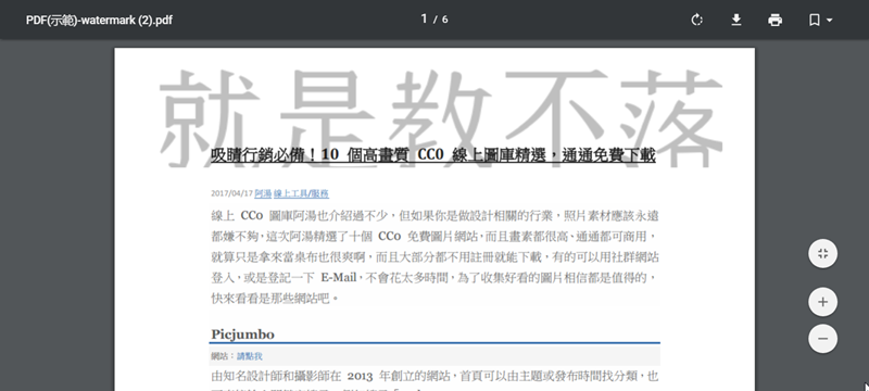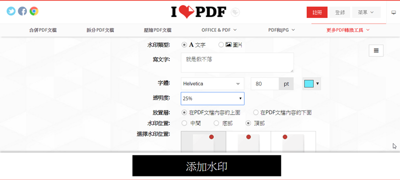 上排「更多 PDF 轉換工具」裡面有添加頁碼、水印或旋轉、解密 PDF 文檔,來看看添加浮水印的功能。