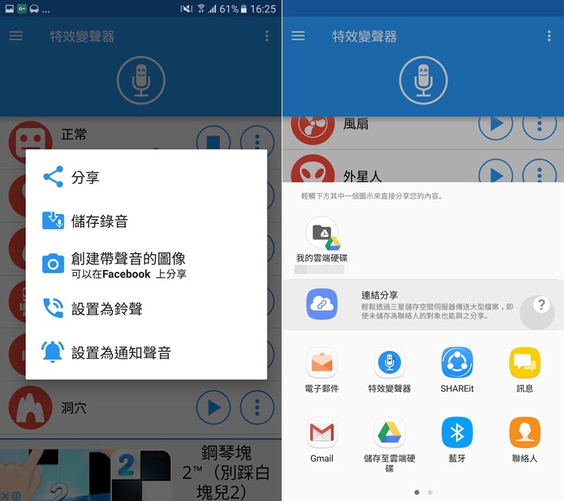 點特效旁的清單圖示可以儲存錄音、創建帶聲音的圖像、設成鈴聲,如果點「分享」會跳出雲端、E-Mail、訊息或連結等途徑讓你選擇,可惜不能直接 Line,要先存到其他地方再轉傳。