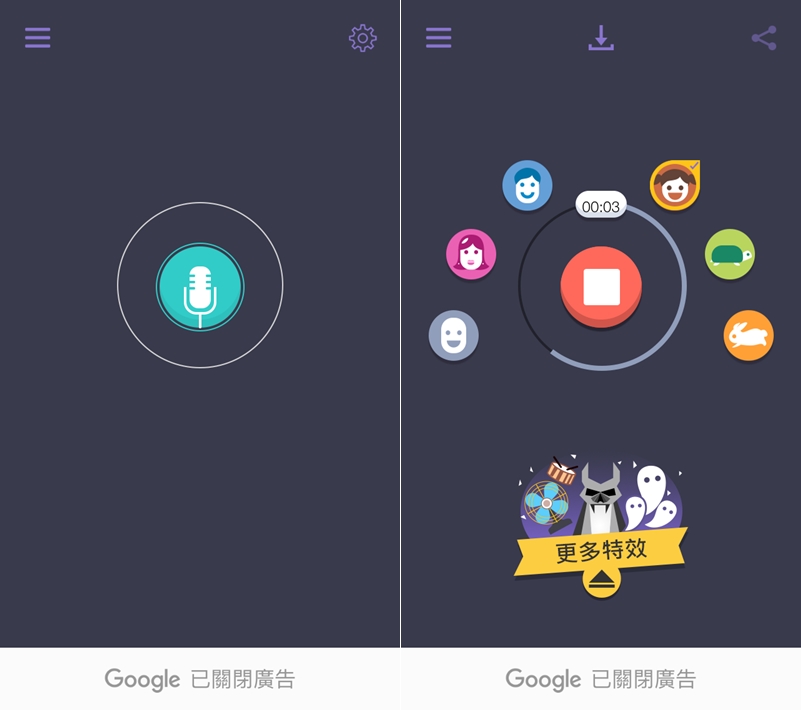 停止後會自動跳出可套用的音效,從氦、六氟化硫這種不清楚是什麼的,到小動物、擎天柱機器人這種大概猜得到音效的,共 40 種,足夠讓你慢慢玩,點箭頭就開始播放,如果看一下廣告、推薦或升級還會得到幾個新特效。