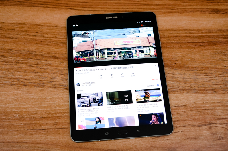 前面我們有提到這次搭載在 Galaxy Tab S3 的喇叭,是與 AKG 知名音響大廠合作所調校的,分別有四顆二組立體聲喇叭,如果橫放看影音時,聲音分別由左邊及右邊播放出來,讓聲音更接近環繞音效的感覺,用來看電影更是效果十足。