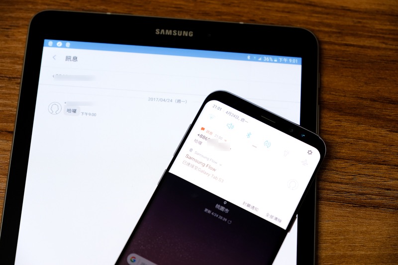 全新的 Samsung Flow APP 可以讓手機、平板及電腦串連起來,這邊阿湯將 Galaxy S8+ 與 Galaxy Tab S3 連結起來,就可以同時收到二台設備的通知以及互相傳送檔案。