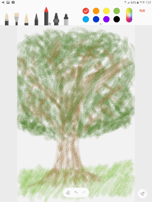 Samsung Notes 裡的筆刷還支援混色,比如像這顆樹阿湯是用蠟筆所繪製出來的,一般的繪圖 APP 如果要畫出樹幹與樹葉混在一起的顏色感是沒辦法的,肯定會是樹幹歸樹幹,樹葉歸樹葉,呈現顏色分開的狀況,特別是如果用水彩筆刷,「混色」就顯的更加重要了。