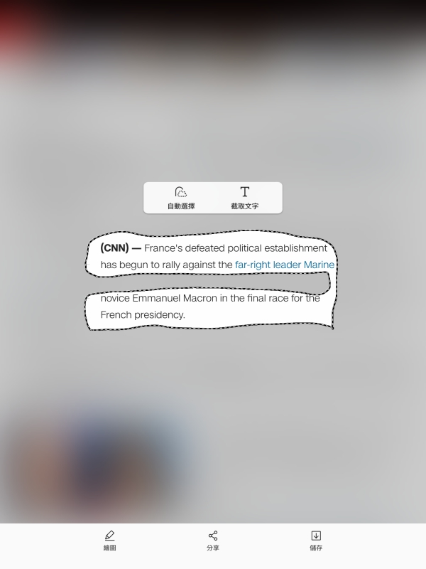 智慧選取,可以直接選取頁面上任一範圍,像是網頁、照片、或者任何畫面都可以,選擇想要截取的文字,可以直接辨識後取出來額外使用。