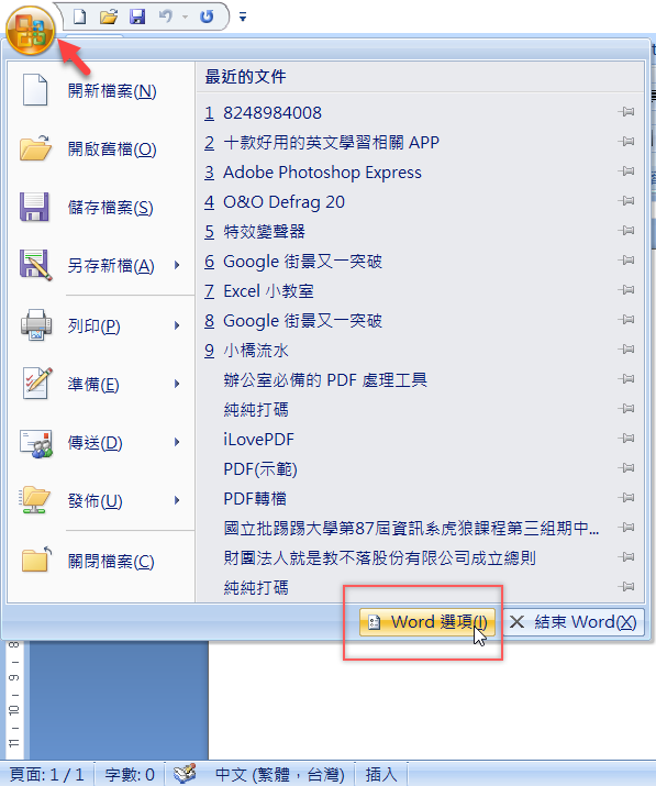 這項設定要使用的是「開發人員」這個功能,一般來說並不會出現在上方工具列,所以我們要先把它叫出來,開啟文件後,點開左上角檔案區找到最底下「Word 選項」。