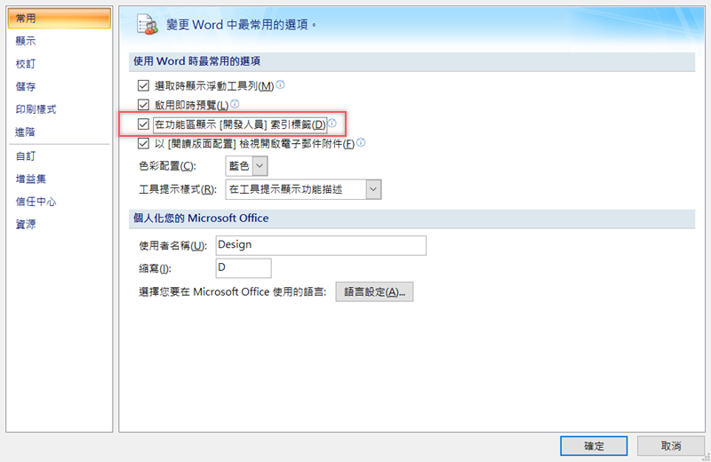然後在常用區,勾選「在功能區顯示開發人員索引標籤」,按確定。
