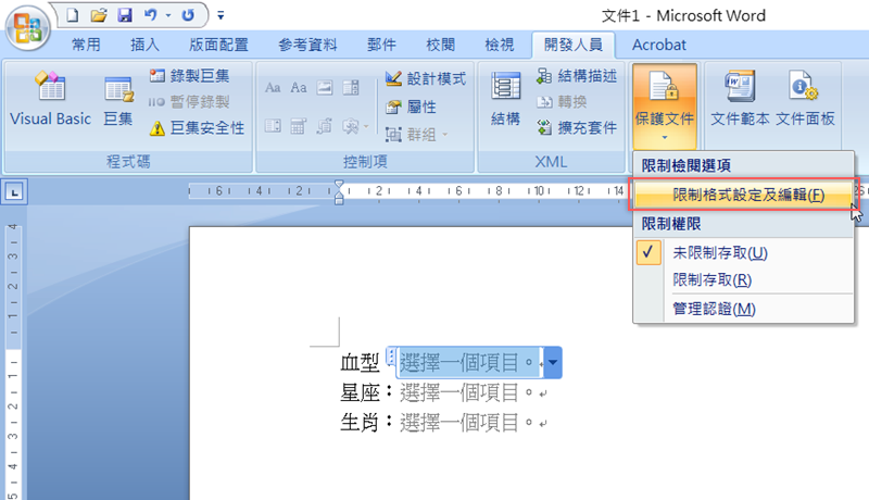 然後記得在保護文件這邊,點進「限制格式設定及編輯」。