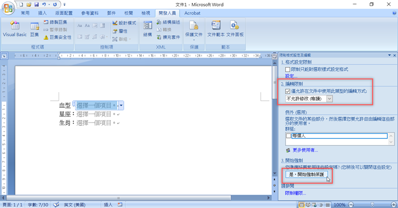 選擇編輯限制後,再輸入密碼強制保護就完成了。