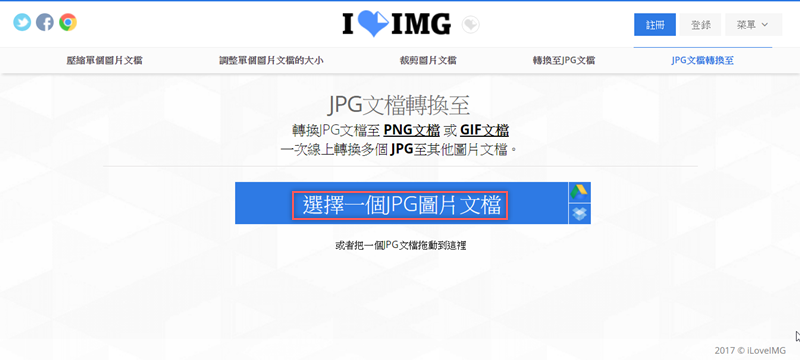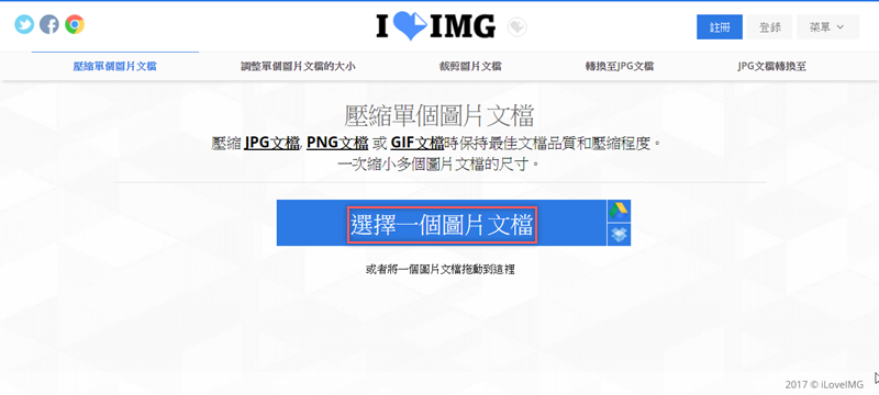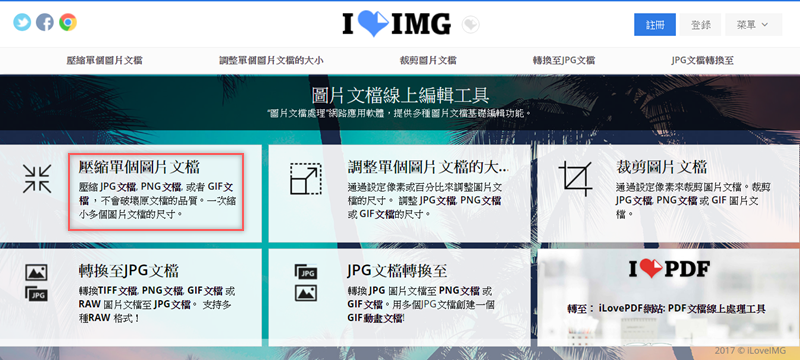 首頁就顯示了網站的五大功能,點擊要用的功能就能對圖片進行編輯或是轉檔,來試試壓縮圖片。