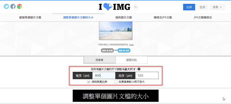 上傳後可以選擇要用像素還是百分比來調整,用像素的話就在寬度與高度的地方輸入數字即可,如果下面有勾保持長寬比例,輸入寬度就會自動跳出高度,像這個檔案就會從 960 x 640 縮成 800 x 533,點調整就到下一步。