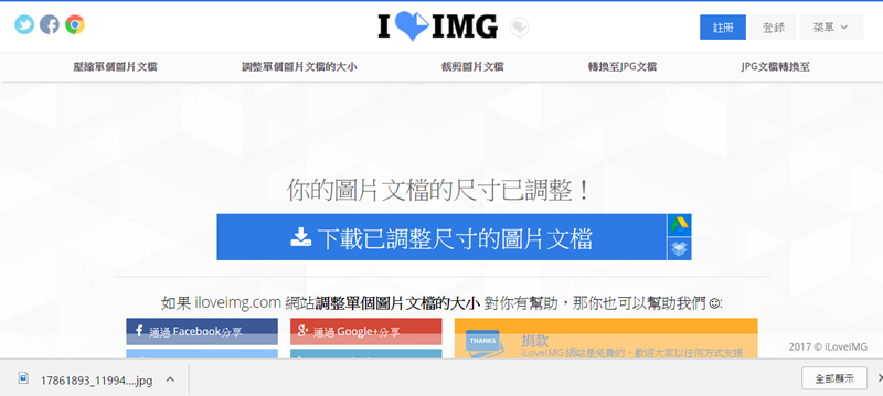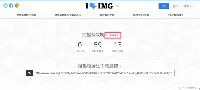 為了維護圖片的隱私,網站上有設定檔案的有效期限,檔案處理完畢後倒數一小時刪除,或點「立刻刪除」,所以要在時間內下載,也可以複製或發送連結。