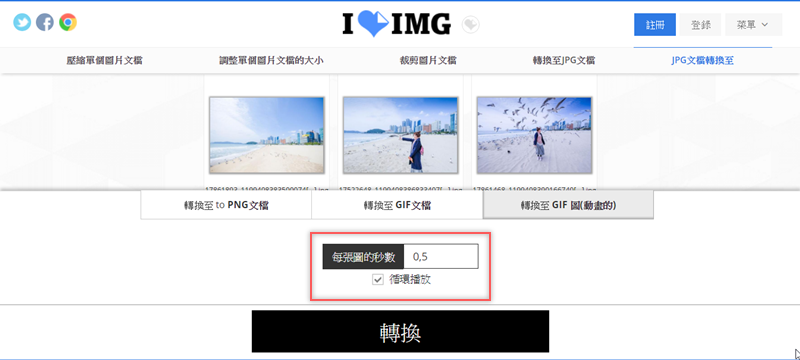 於是阿湯就上傳了 3 張圖,下面有轉換成 PNG、GIF 文檔與 GIF(動畫的)選項,選動畫後,可以調整每張圖的秒速及要不要循環播放,完成就按轉換。