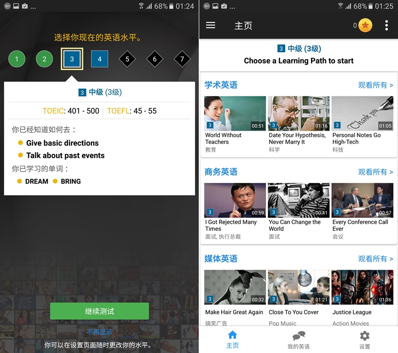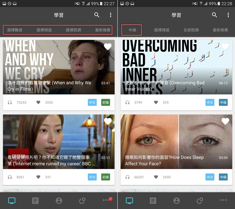 這個 APP 也是以影片為主,一開始會先讓你選程度,有七級可選並附上程度參考,假設選中級,就會列出適合中級學習的影片。