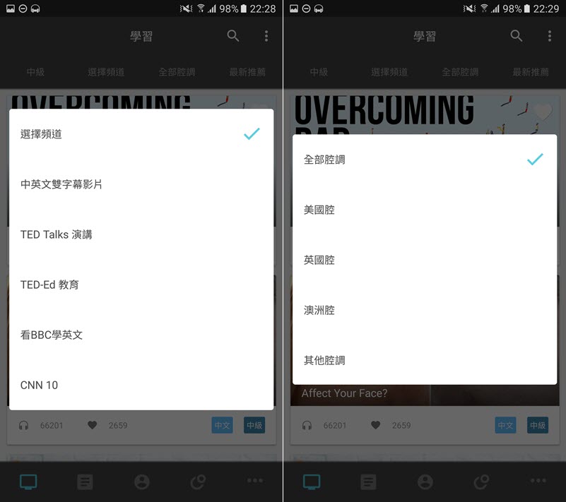 VoiceTube 之前阿湯有介紹網站,這次介紹的是 APP 版,使用方式跟網站差不多,但內容比較少,首頁可以先選難度,例如選中級,就會幫你過濾出屬於中級程度的內容。