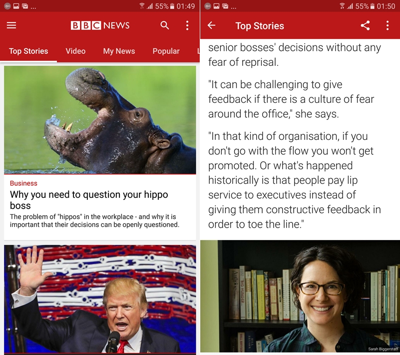 顧名思義就是 BBC 新聞集錦,首頁依時間排列,往下滑有一些專題介紹,像這個商業類別的文章就是教你怎麼應付河馬老闆(抱歉阿湯不清楚那是怎樣的老闆),點進去後發現是純文章,右上角可以設定一些功能。