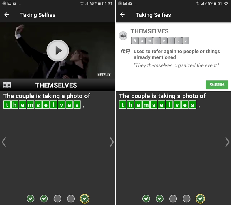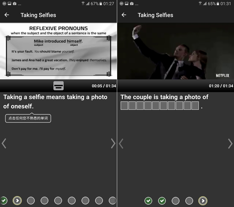 文字會與影片同步播放,有不懂的單字點它就會跳出解釋,有趣的是還有聽寫的功能。