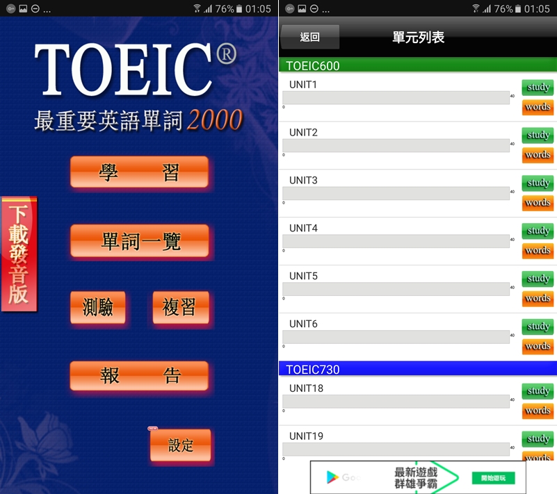 知名的賴世雄英語也出了 APP,阿湯有先學了一些內容所以在 Unit 1 會有進度在,但很多單字還沒讀過所以達成率很低。
