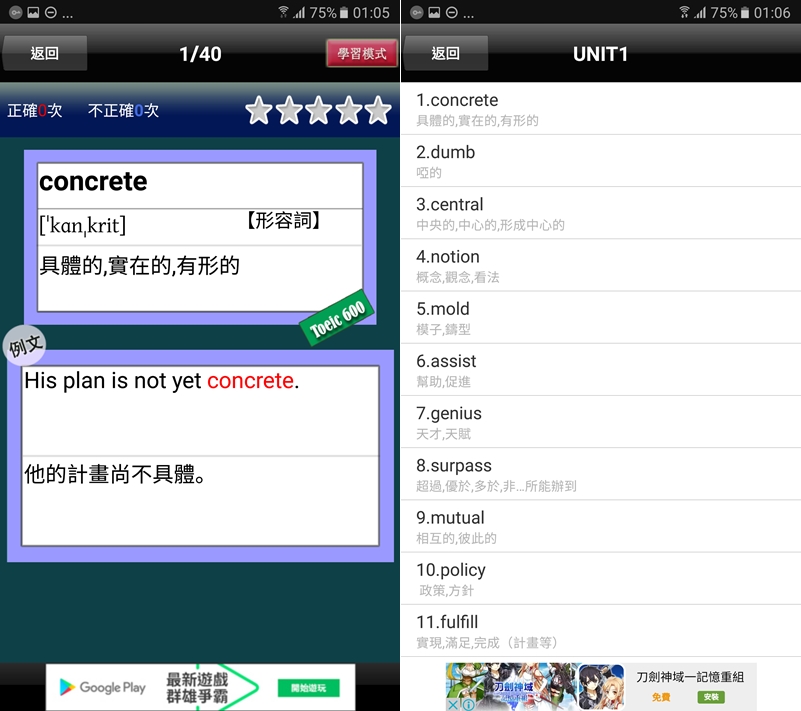 或是從「單詞一覽」進來學習,註解與例句都有,像這個「concrete」就是多益 600 分的程度內容,想要快一點背可以從單字列表直接背 。