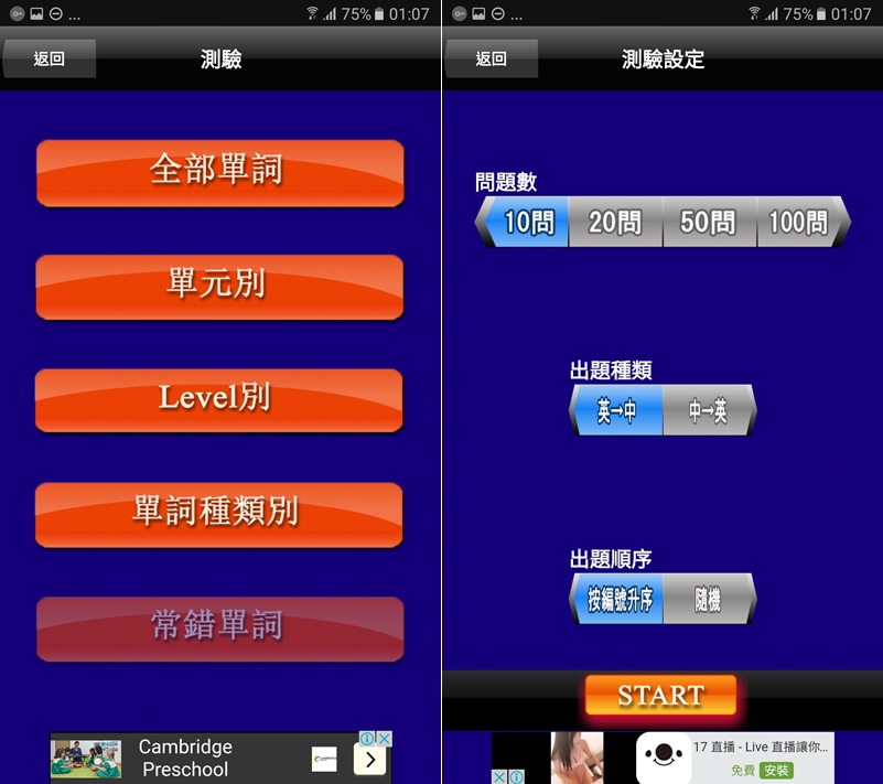 測驗的部分可以選單元或程度來出題,再設好題數和順序就可以開始作答了。